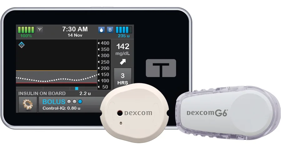 Our Control-IQ technology can help make managing diabetes easier by using Dexcom G7 or Dexcom G6 CGM values to predict glucose levels 30 minutes ahead and automatically adjusting insulin.