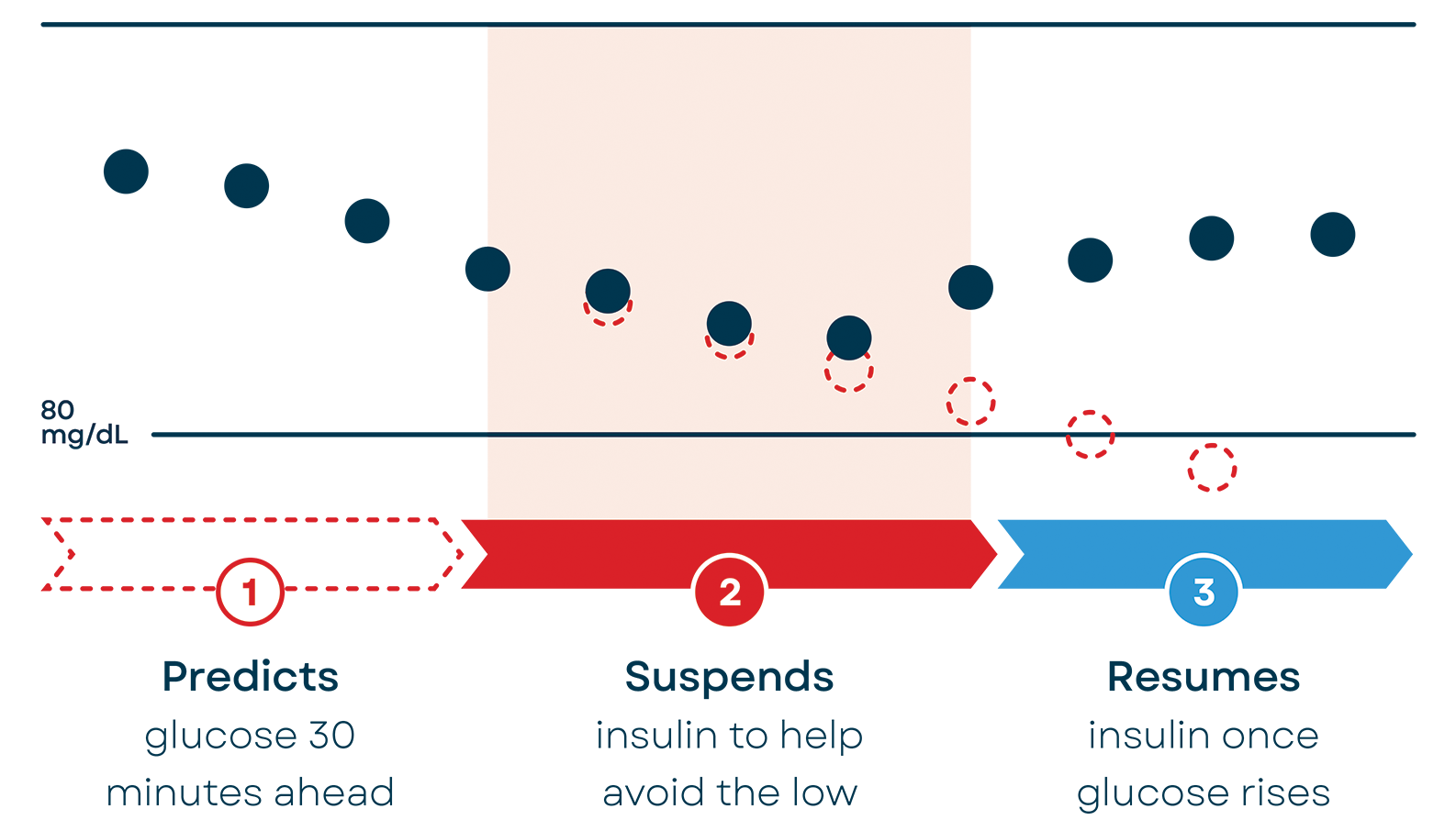 La technologie Basal-IQ prédit et aide à prévenir l’hypoglycémie. Elle peut mettre en marche et arrêter l’administration d’insuline toutes les 5 minutes.