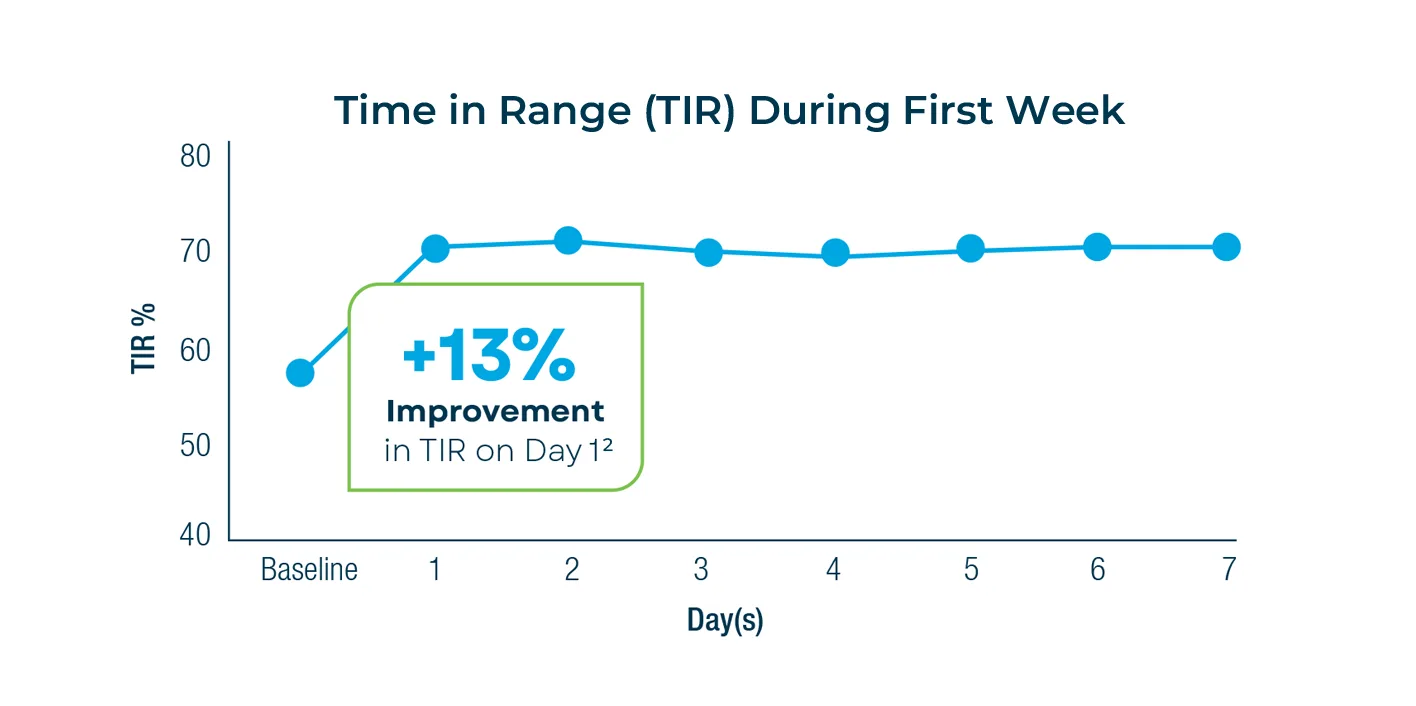 Control-IQ+ has no learning time. Improvements were seen within the first 24 hours and the results were sustained during the following 13 weeks. It predicts, calculates, and automatically adjusts insulin to achieve better glucose control while providing best-in-class outcomes.